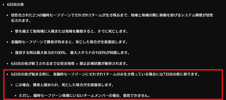 6日目の夜に臨時セーフゾーンが生成された後、2つの臨時セーフゾーンでそれぞれ1チームが生き残るまで、地域と地域の間に移動を妨げるシステム障壁が活性化されます。各臨時セーフゾーンで勝ったチームは、死亡した味方が全員復活します。