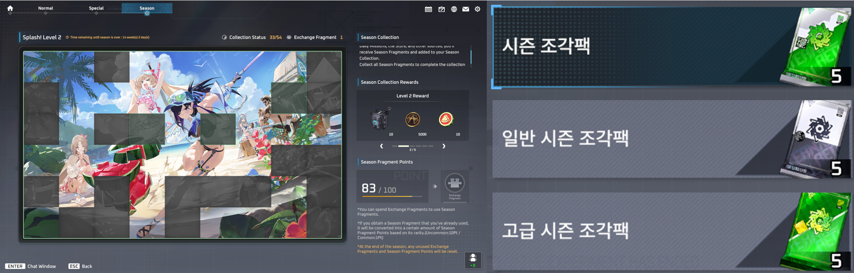 모든 시즌 조각을 등록하면 시즌 컬렉션이 완성되어 보상을 획득할 수 있습니다.